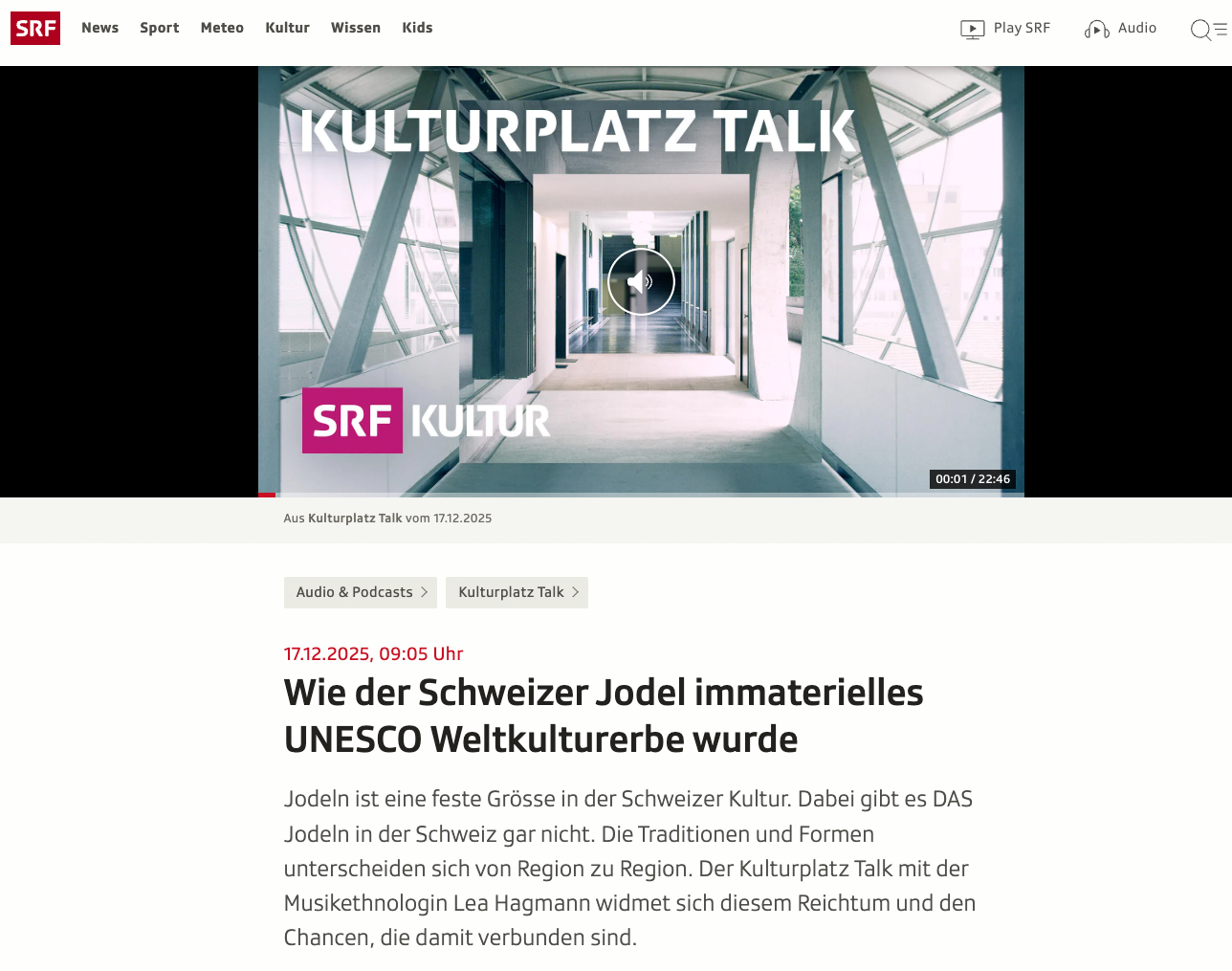 Interview mit Dr. Lea Hagmann vom Institut für Musikwissenschaft der Universität Bern über historische und kulturelle Aspekte des Jodels anlässlich der Aufnahme des Schweizer Jodelns in das immaterielle UNESCO-Weltkulturerbe.