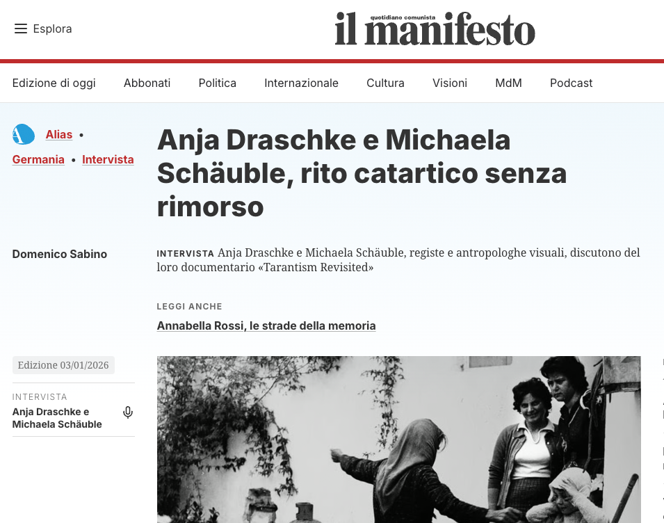 Interview mit Prof. Dr. Michaela Schäuble vom Institut für Sozialanthropologie der Universität Bern und Prof. Dr. Anja Dreschke von der Universität der Künste Berlin über ihr Dokumentarfilmprojekt «TARANTISM REVISITED» zum Tarantismus in Süditalien.