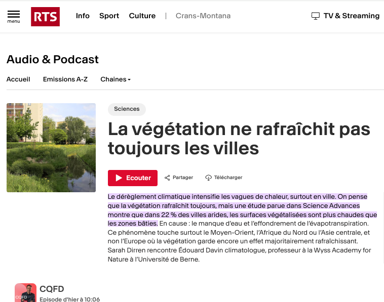 Audiobeitrag über eine neue Studie, die zeigt, dass begrünte Flächen in Städten, vor allem im Nahen Osten, in Nordafrika und in Zentralasien, nicht kühlend wirken, sondern wärmer sind als bebaute Flächen. Dazu äussert sich Prof. Dr. Édouard Davin von der Wyss Academy for Nature an der Universität Bern.