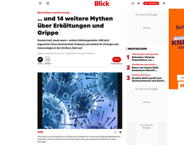 Artikel über Fakten und Mythen rund um Erkältungen und Grippe. Dazu äussert sich Prof. Dr. Artur Summerfield vom Institut für Virologie und Immunologie (IVI) und der Vetsuisse-Fakultät der Universität Bern.