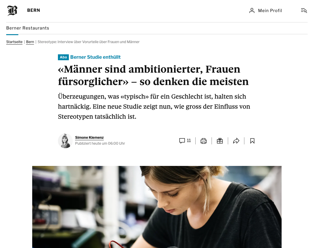 Interview mit Dr. Christa Nater vom Institut für Psychologie der Universität Bern über eine neue Studie unter ihrer Leitung, die zeige, wie stark Geschlechterstereotype mit beruflichen Rollen und der sozialen Struktur von Gesellschaften zusammenhängen.