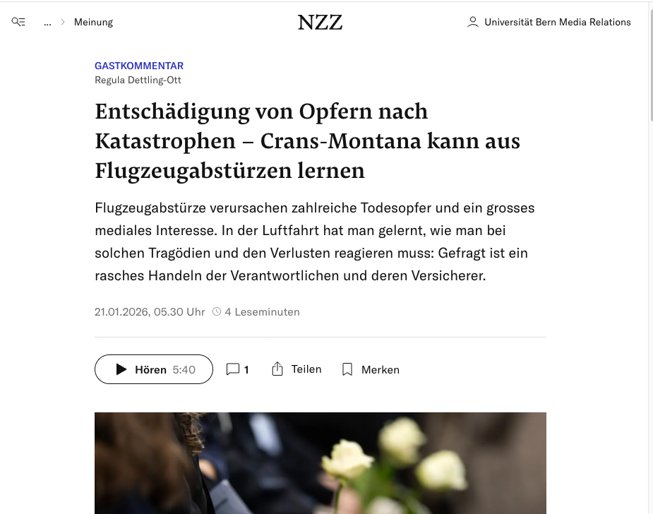 Gastkommentar von Prof. Dr. Regula Dettling-Ott vom Institut für Europa- und Wirtschaftsvölkerrecht der Universität Bern über die Möglichkeit, aus dem Umgang mit Tragödien in der Luftfahrt Lehren für den Umgang mit den Betroffenen der Brandkatastrophe von Crans-Montana zu ziehen.