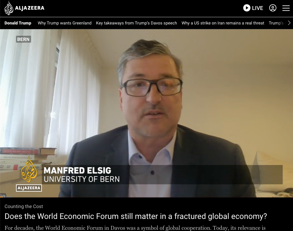 Videobeitrag darüber, dass das Weltwirtschaftsforum (WEF) in Davos zunehmend hinterfragt werde. Dazu äussert sich Prof. Dr. Manfred Elsig vom World Trade Institute der Universität Bern.