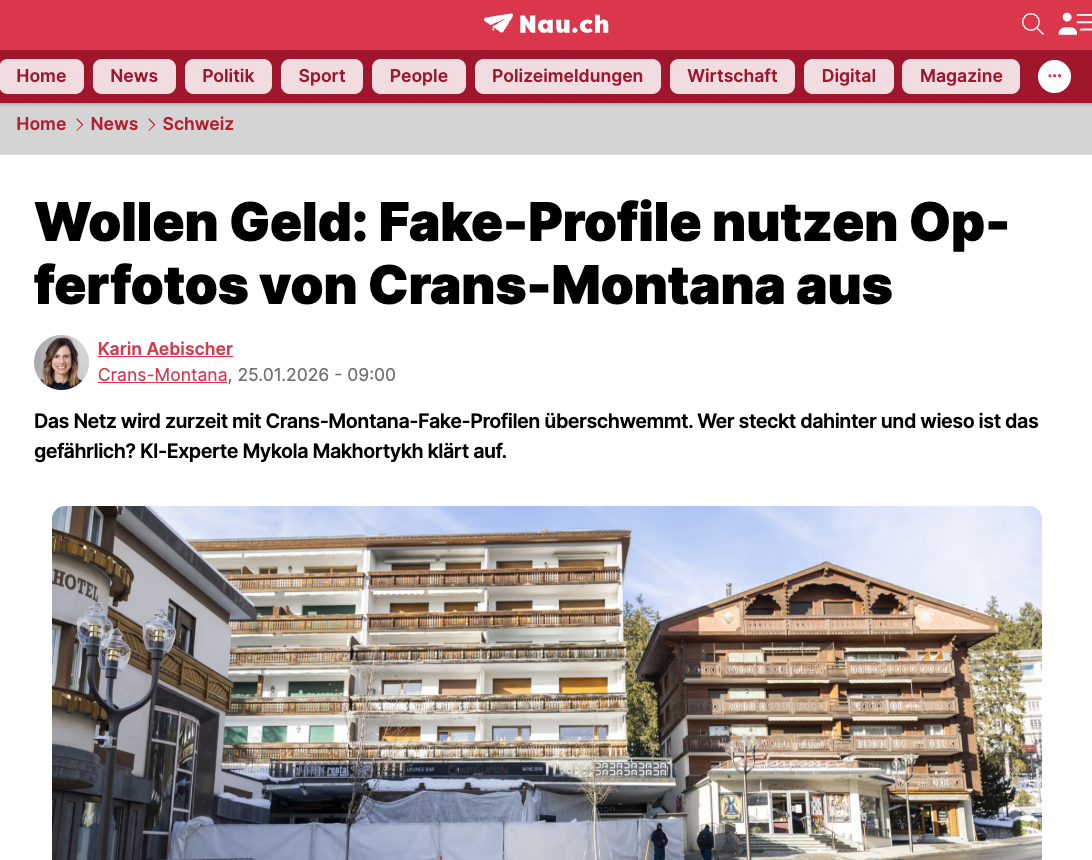 Artikel über die Verbreitung unechter und KI-generierter Inhalte zur Brandkatastrophe von Crans-Montana auf den sozialen Medien. Dazu äussert sich Dr. Mykola Makhortykh vom Institut für Kommunikations- und Medienwissenschaft der Universität Bern.