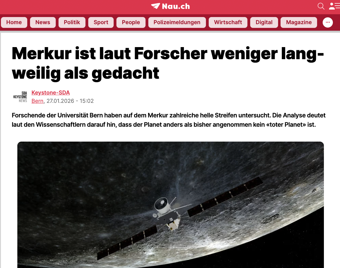Artikel über eine Studie unter der Leitung von Forschenden der Universität Bern und dem Astronomischen Observatorium von Padua (INAF), die erstmals helle Streifen auf dem Merkur nachweisen konnte. Diese würden vermutlich durch anhaltende Ausgase flüchtiger Stoffe aus dem inneren des Planeten entstehen und darauf hindeuten, dass der Planet geologisch aktiver ist als bislang angenommen. Zitiert wird Dr. Valentin Bickel vom Center for Space and Habitability der Universität Bern und vom NFS PlanetS, Erstautor der Studie.