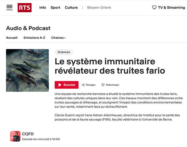 Audiobeitrag über eine Studie von Forschenden der Universität Bern, die erstmals das Immunsystem der Bachforelle Zelle für Zelle untersucht hat. Im Interview äussert sich Studienletztautorin Prof. Dr. Irene Adrian-Kalchhauser vom Institut für Fisch- und Wildtiergesundheit (FIWI) der Universität Bern.