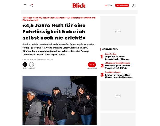 Interview mit Prof. Dr. Marianne Heer, ehemalige Oberrichterin am Kantonsgericht Luzern und Lehrbeauftragte am Institut für Strafrecht und Kriminologie der Universität Bern darüber, dass die Walliser Staatsanwaltschaft nach dem Brand in Crans-Montana gegen neun beschuldigte Personen ermittle. Laut Einschätzung sei eine Anklage frühestens 2027 zu erwarten.