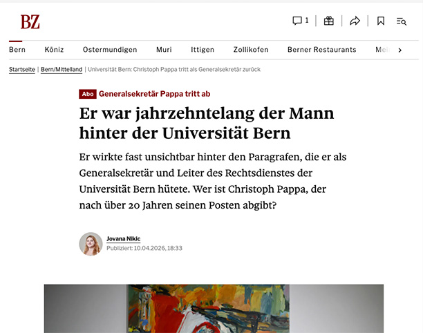 Porträt von Dr. Christoph Pappa, der sich nach 21 Jahren als Generalsekretär und Leiter des Rechtsdienstes der Universität Bern per 1. April in den Ruhestand verabschiedet hat. Der Universität Bern bleibt Pappa ab August 2026 als Präsident der Rekurskommission erhalten.