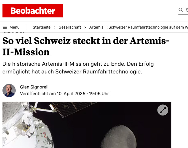 Weiterer Artikel mit Audiobeitrag darüber, dass die NASA-Mission Artemis II erstmals seit über 50 Jahren wieder Menschen in die Nähe des Mondes bringen soll und als wichtiger Testlauf für künftige bemannte Mondlandungen sowie eine mögliche langfristige Präsenz dient. Im Beitrag wird zudem erwähnt, dass Prof. Dr. Peter Wurz vom Physikalischen Institut der Universität Bern ein Massenspektrometer zur künftigen Vor-Ort-Analyse von Mondgestein entwickelt.