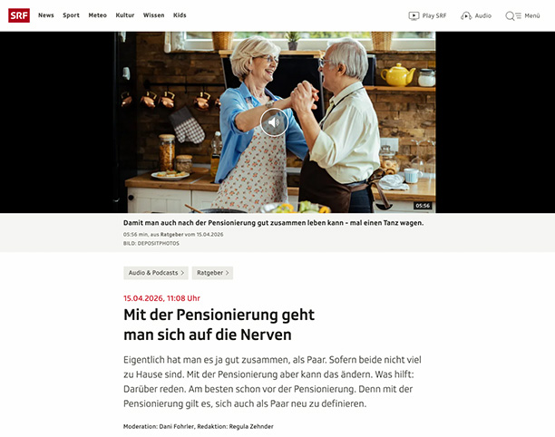 Artikel darüber, dass die Pensionierung für Paare ein einschneidender Lebensübergang sei, der neue Absprachen über gemeinsame und getrennte Zeit, Alltagsgestaltung und Rollenverteilung erforderlich machen könne. Dazu äussert sich Prof. em. Dr. Pasqualina Perrig-Chiello vom Institut für Psychologie der Universität Bern.