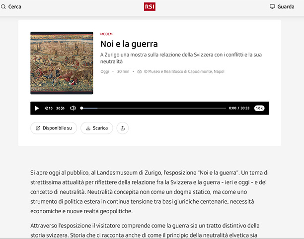 Beitrag über die neue Ausstellung «Noi e la guerra» im Landesmuseum Zürich, die das Verhältnis der Schweiz zu Krieg und Neutralität historisch und gegenwartsbezogen beleuchte. Es äussert sich u.a. dazu Prof. Dr. Sacha Zala vom Historischen Institut der Universität Bern.