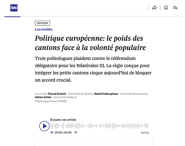 Kolumne von Prof. Dr. Adrian Vatter vom Institut für Politikwissenschaft (IPW) der Universität Bern, Prof. Dr. Rahel Freiburghaus von der Universität Lausanne und Pascal Sciarini von der Universität Genf über das Referendumsverfahren bei den Bilateralen III und das Spannungsverhältnis zwischen Föderalismus und Demokratie in der Schweiz. Die Kolumne ist ebenso in 24 heures erschienen.